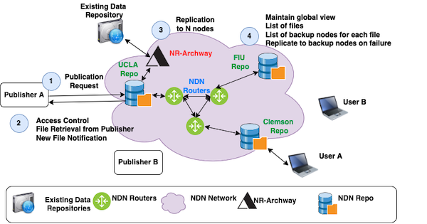 By leveraging the results from 10-year NDN research, this work will create a distributed federation of file repositories that enables scientific communities to systematically store and access large amounts of data scalably and resiliently. The federation will be loosely coupled based on domain-relevant names and offer easy integration with existing scientific workflows. The federation will self-organize, automatically accommodating new repositories joining and maintaining a degree of file replication in face of node failures and recoveries.